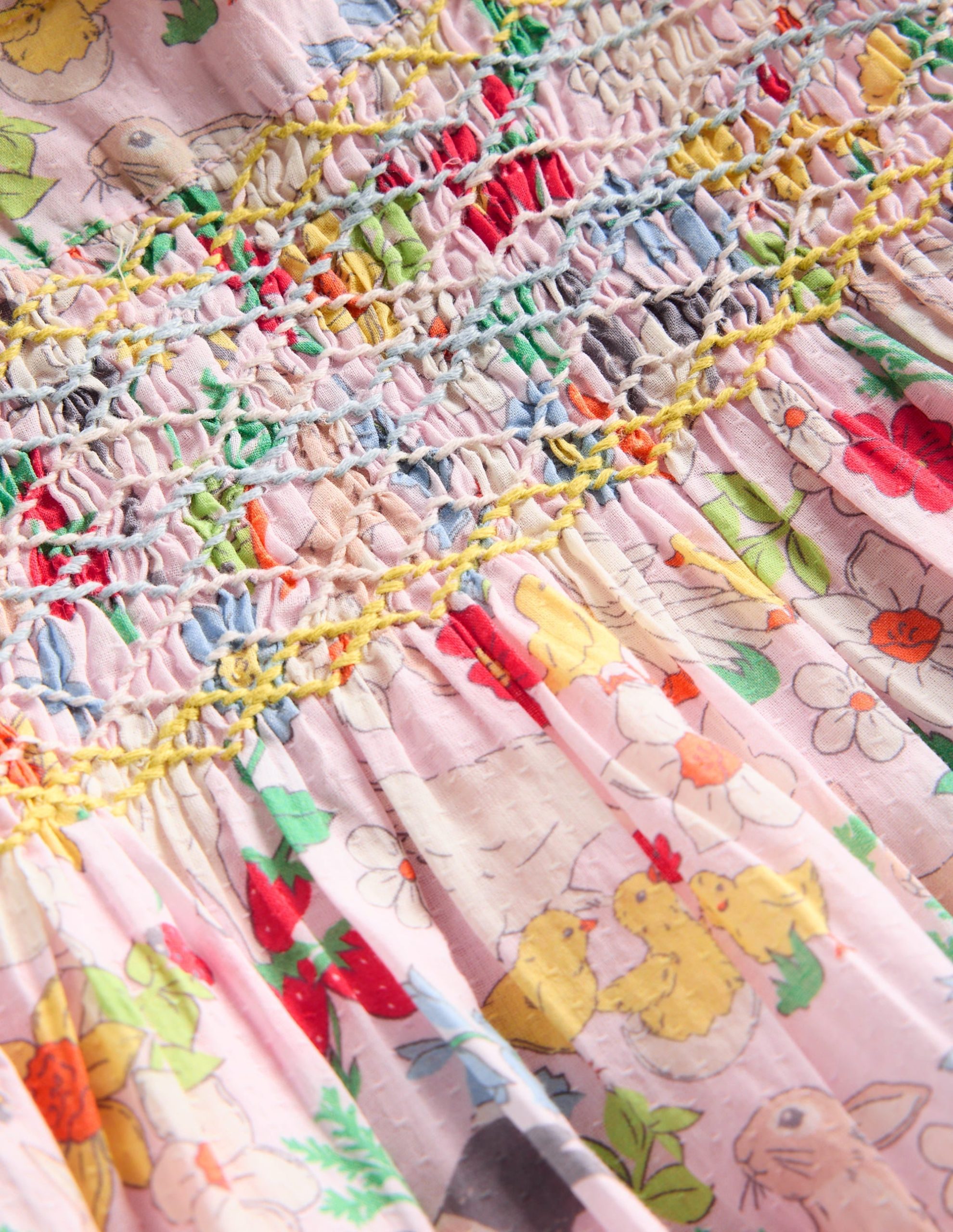 Our Adeline dress has hand-smocked detailing on the front framed by frilled shoulders. Oh and did we mention the Peter Pan collar and buttons at the back?