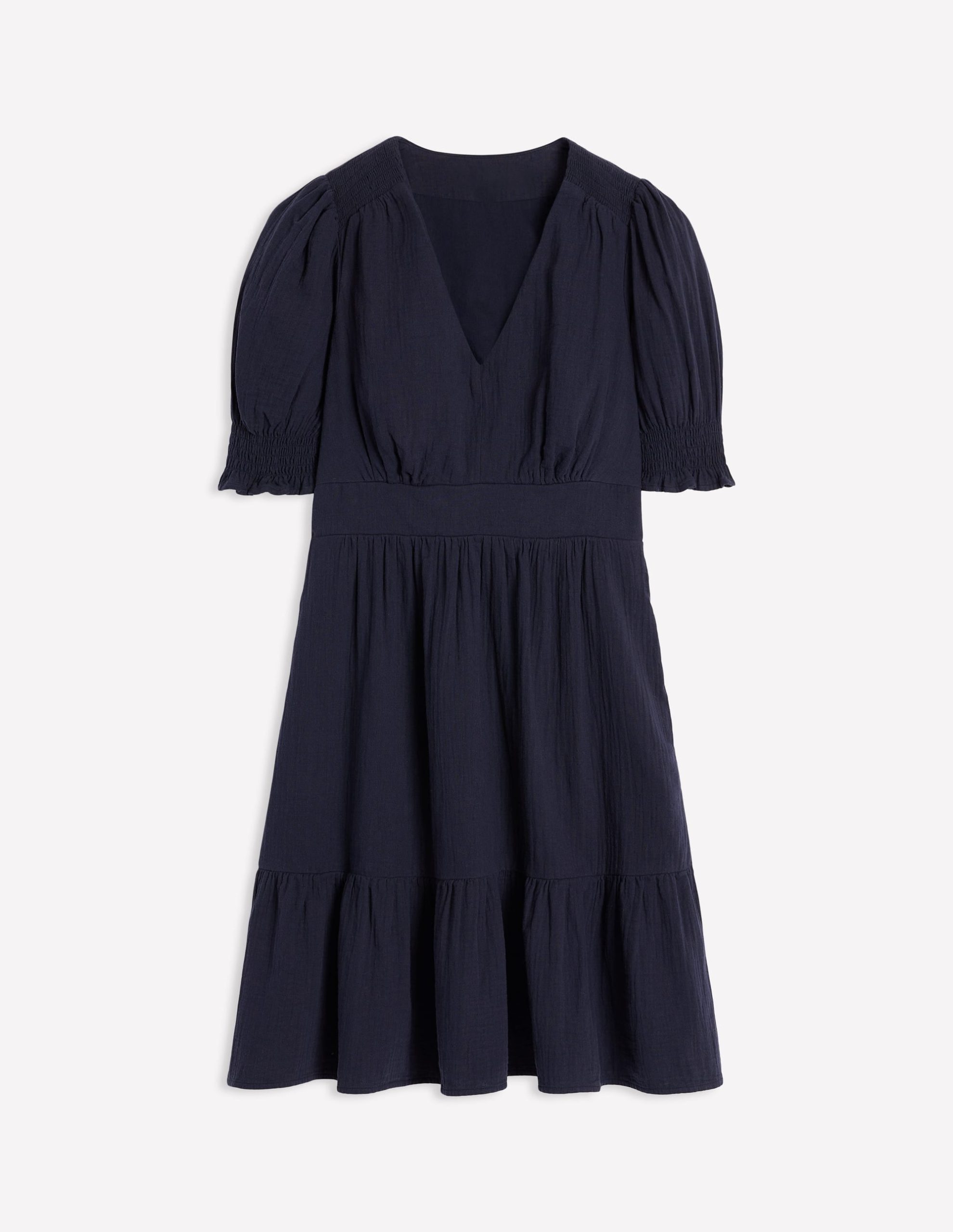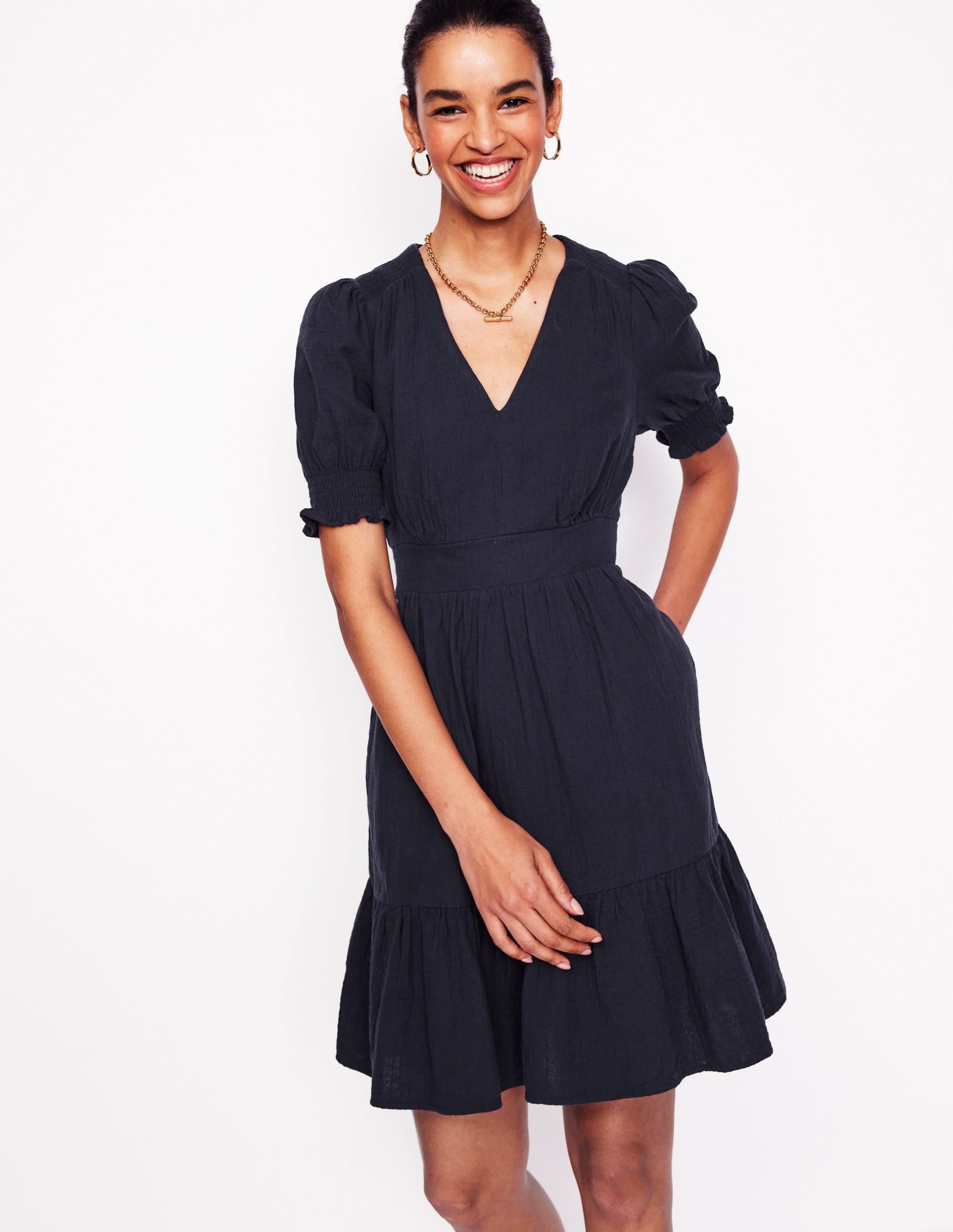 Our Anna dress spun in cotton and with a higher hem and bright colourways for summer. The shoulder smocking. puff sleeves and the tiered skirt (with hidden pockets) are mainstays.