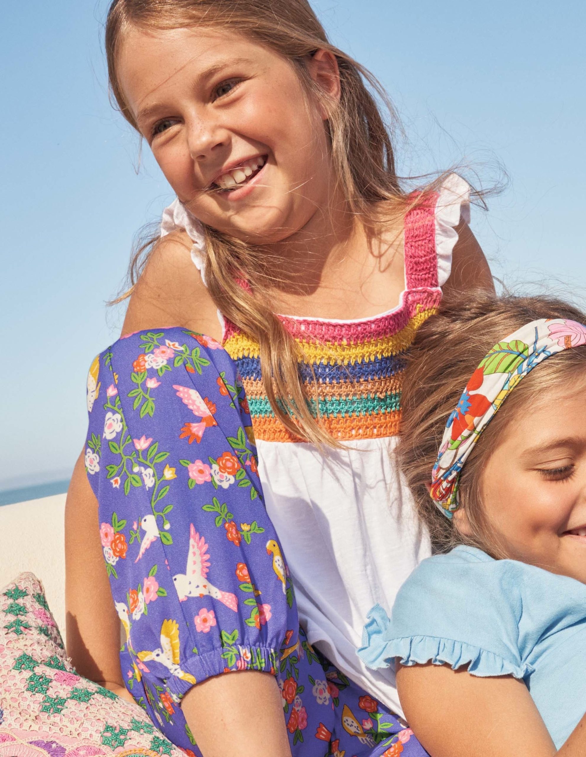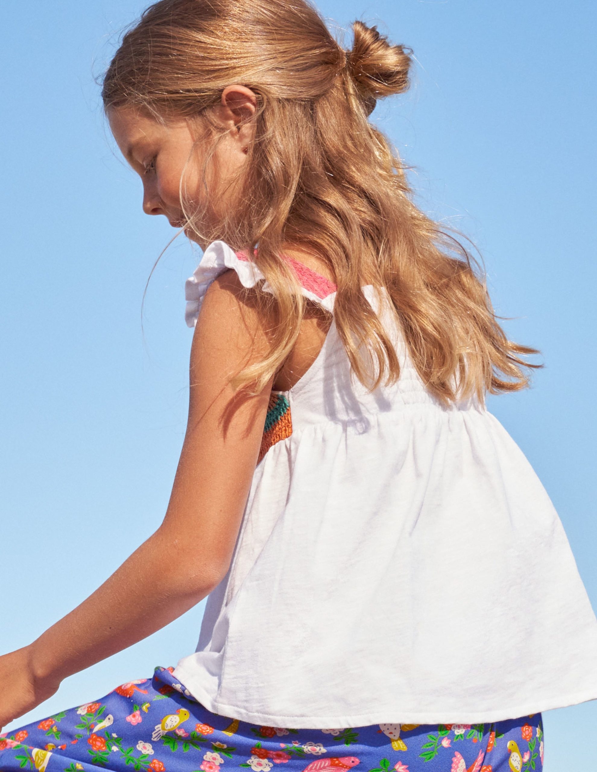 Crafted from supersoft and breezy cotton. our sleeveless top has sunny-day dressing covered. We’ve given it a neat square neckline that’s emphasised by contrasting stripy crochet detailing. Gathers add extra volume through to the wide hem. giving the fit a relaxed feel. while frills bring some flutter to the straps.