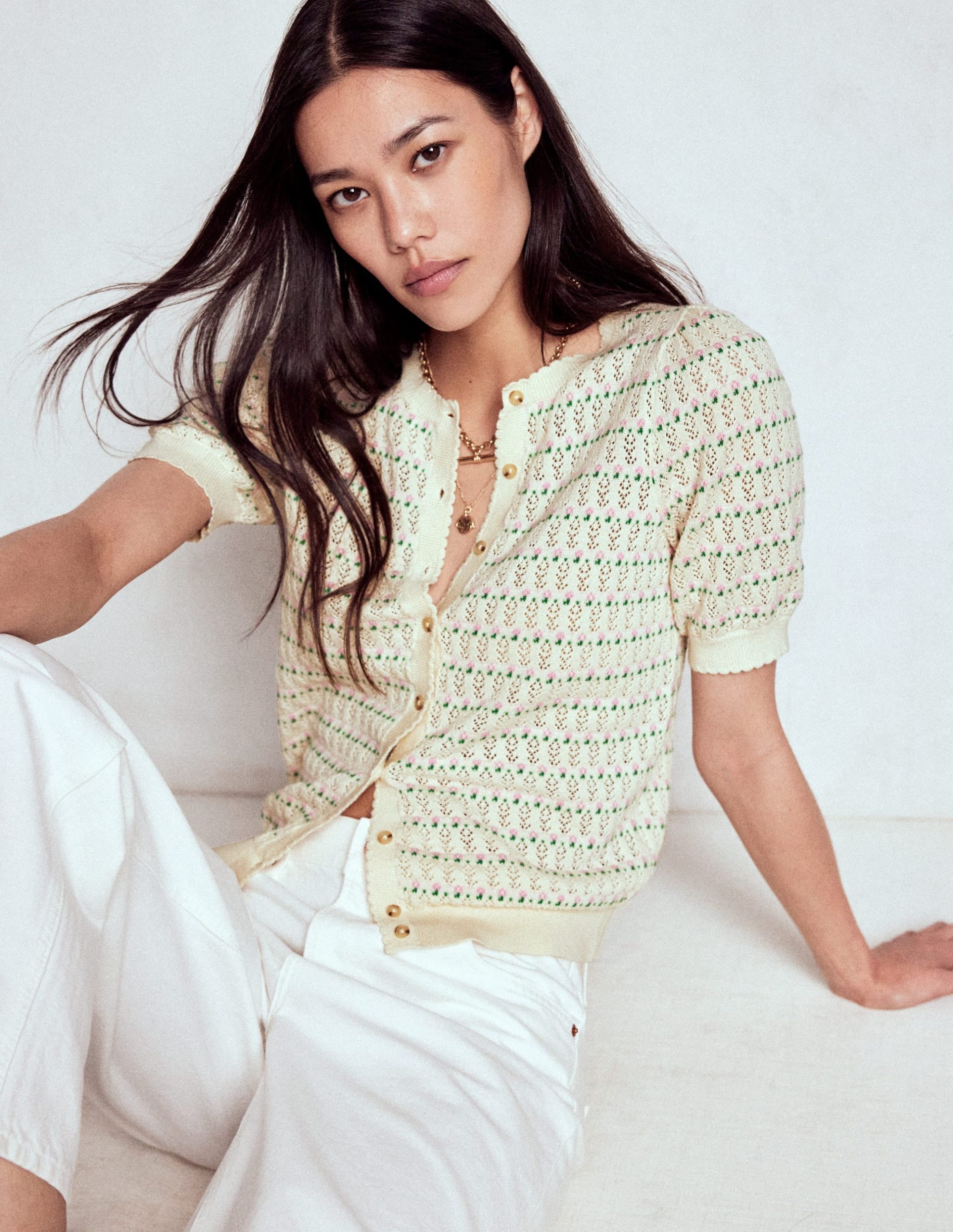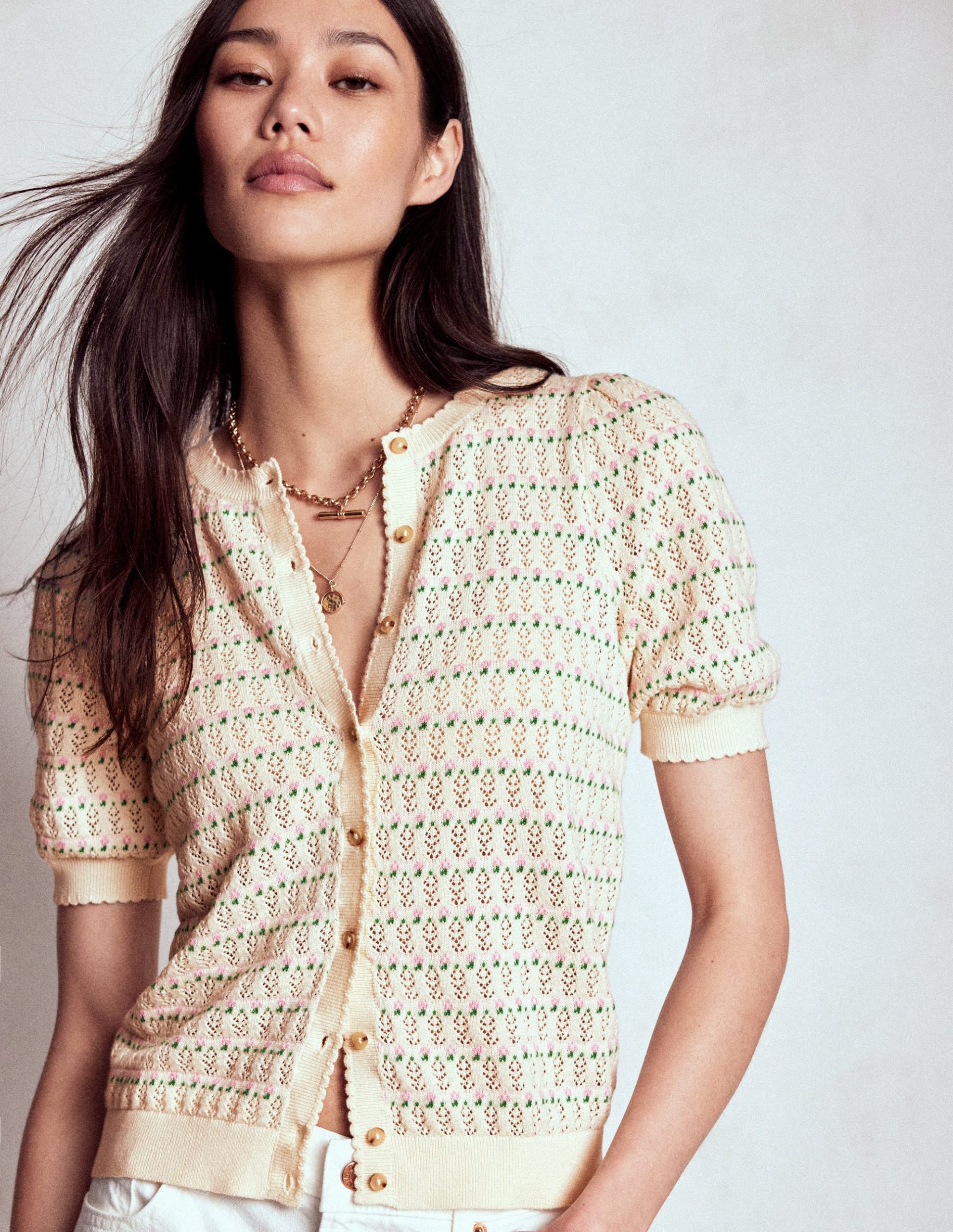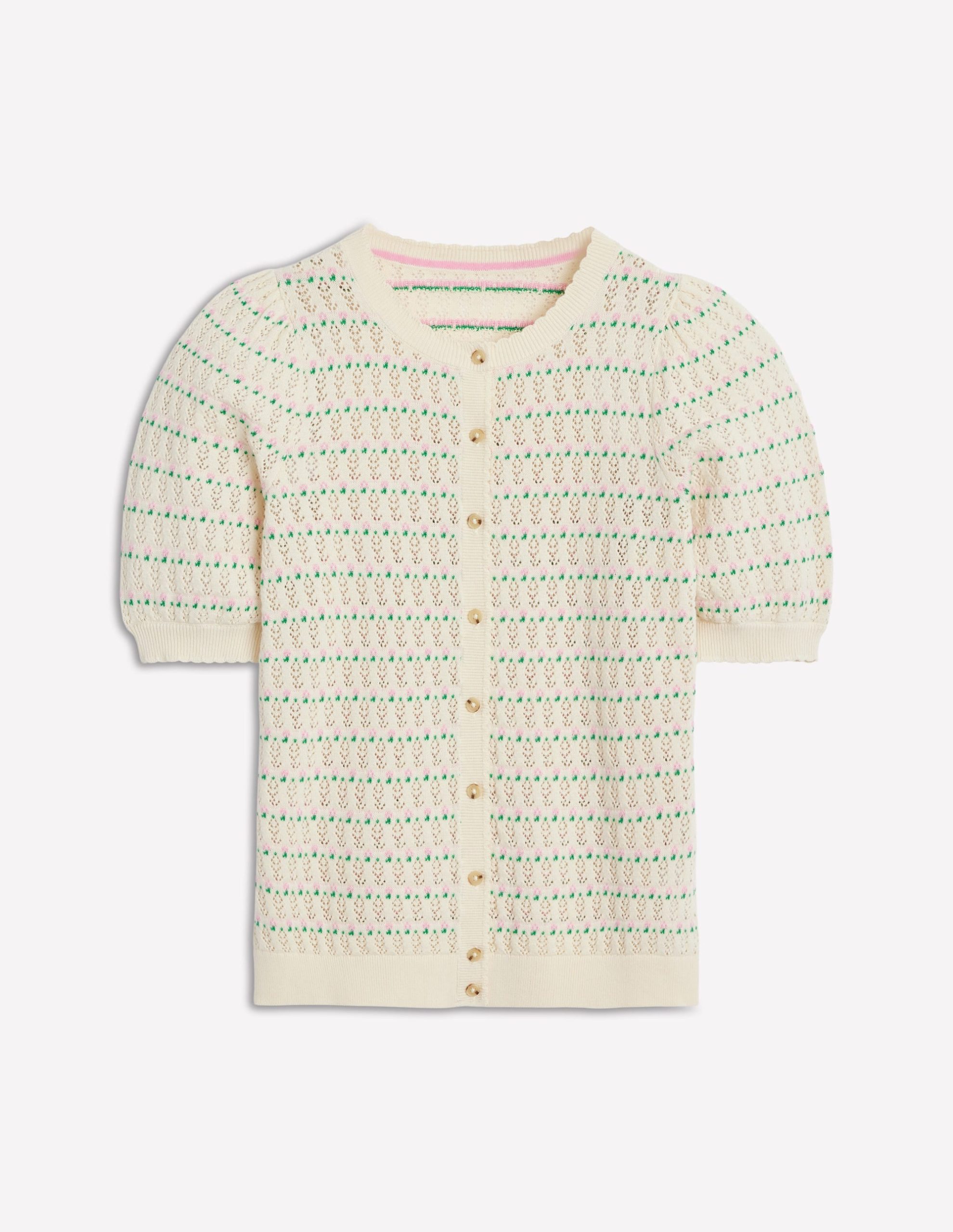 You can count on Dot to elevate your everyday look with delicate pointelle stitch. short puff sleeves and scalloped trim. Make this romantic layer your new go-to summer knit.