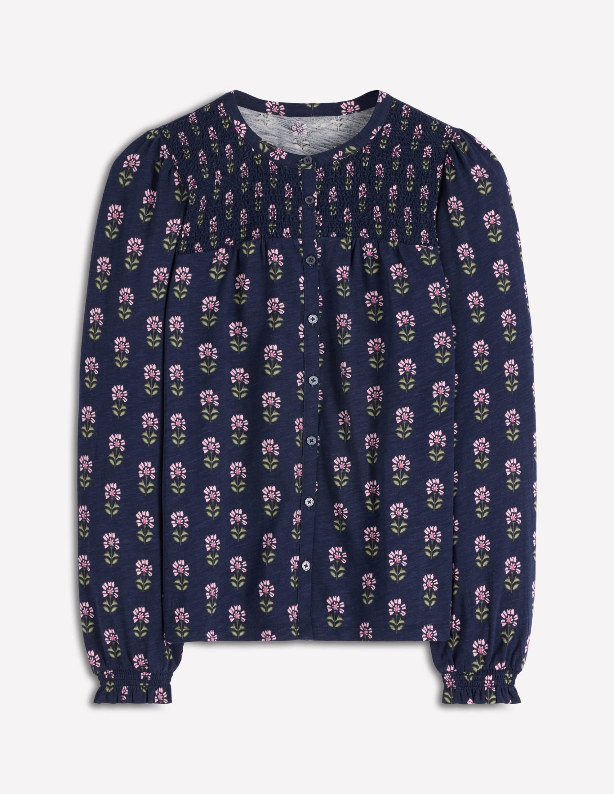 Elsa Smocked Yoke Jersey Shirt-Navy. Woodblock Flower