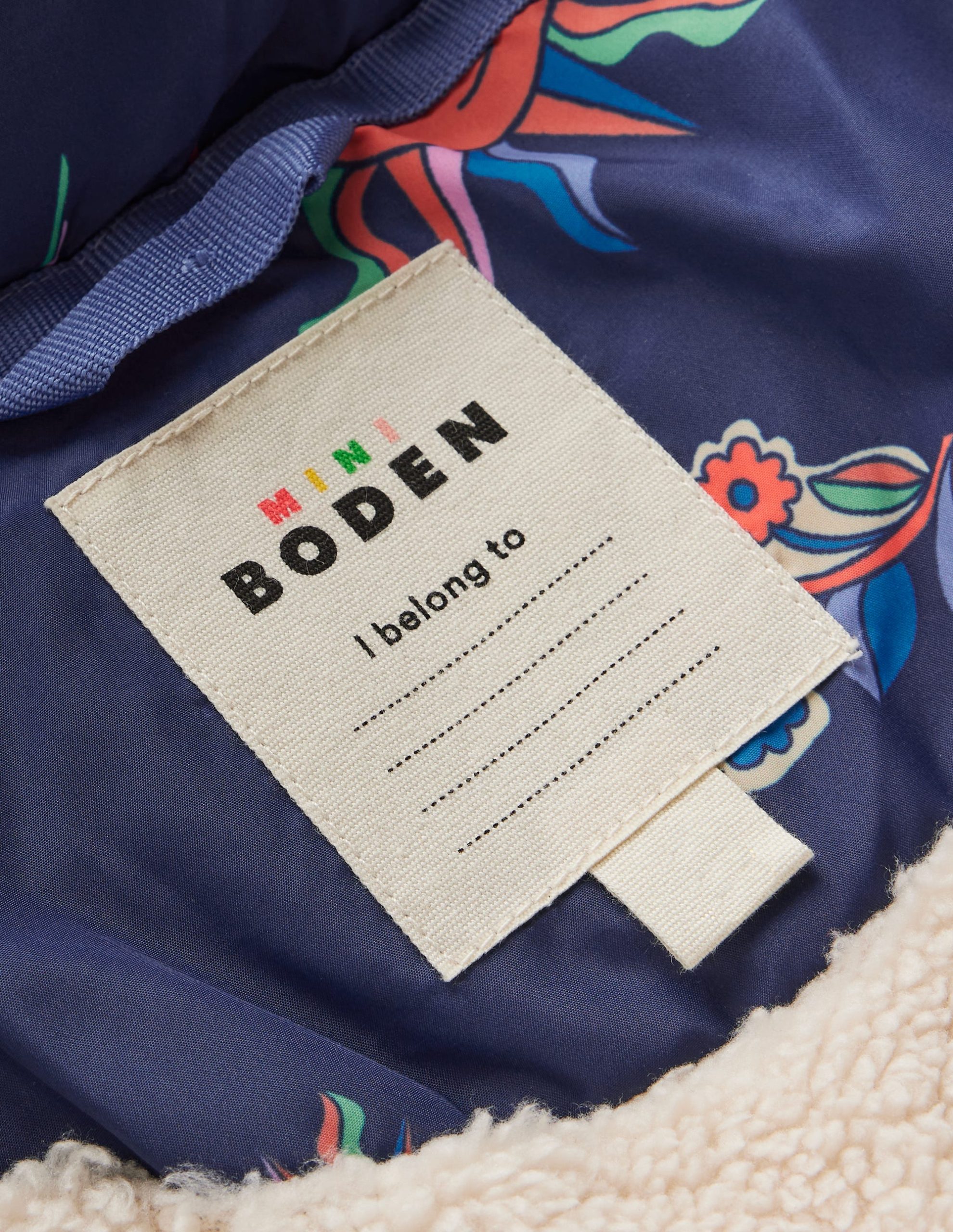 This longer length padded coat is made for outdoor adventures and park fun. It has a snuggly sherpa lining and a detachable hood. Poppers at the side seam mean Minis can race about to their heart’s content.