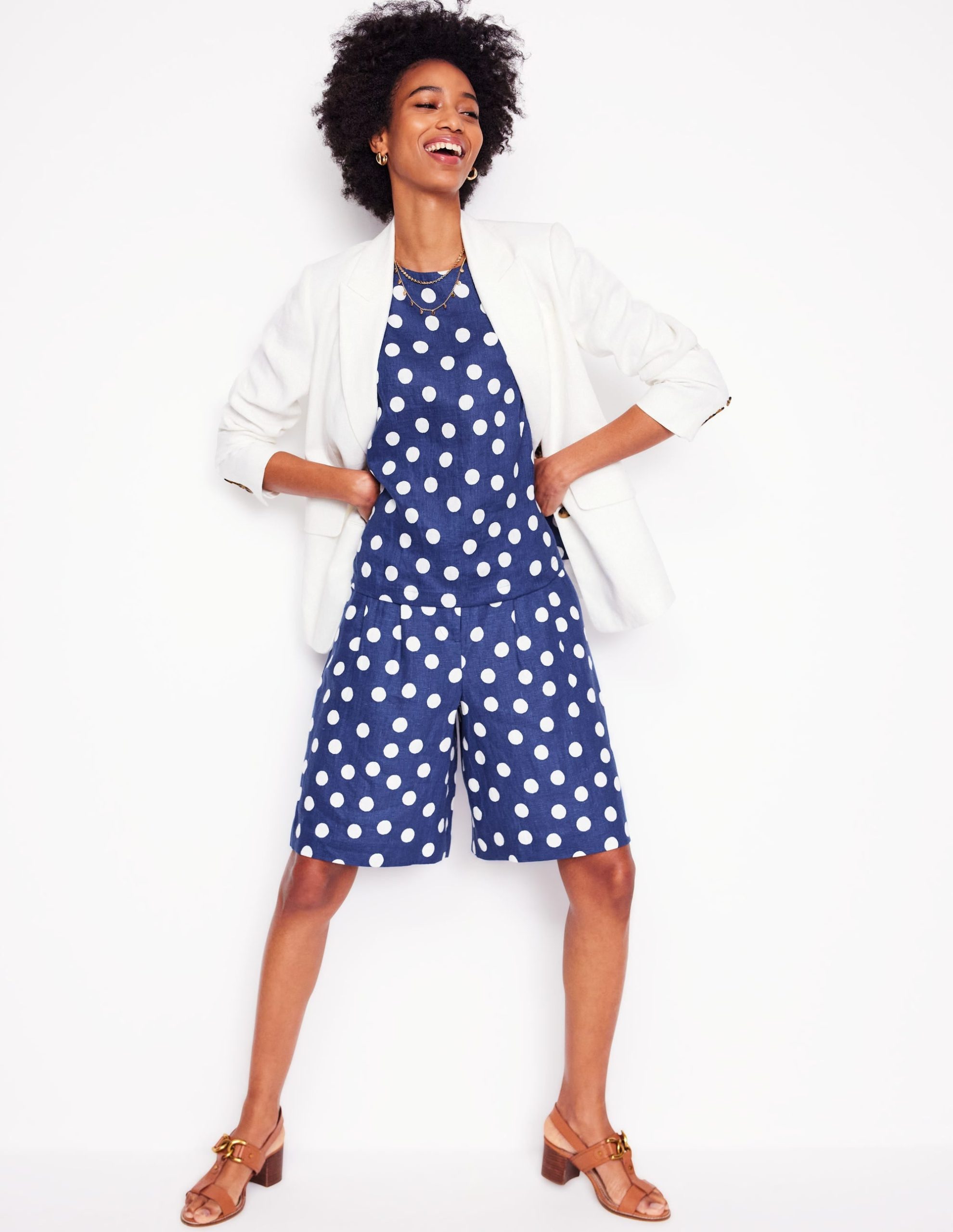 Pleat Linen Wide Leg Shorts-Navy Painted Dot