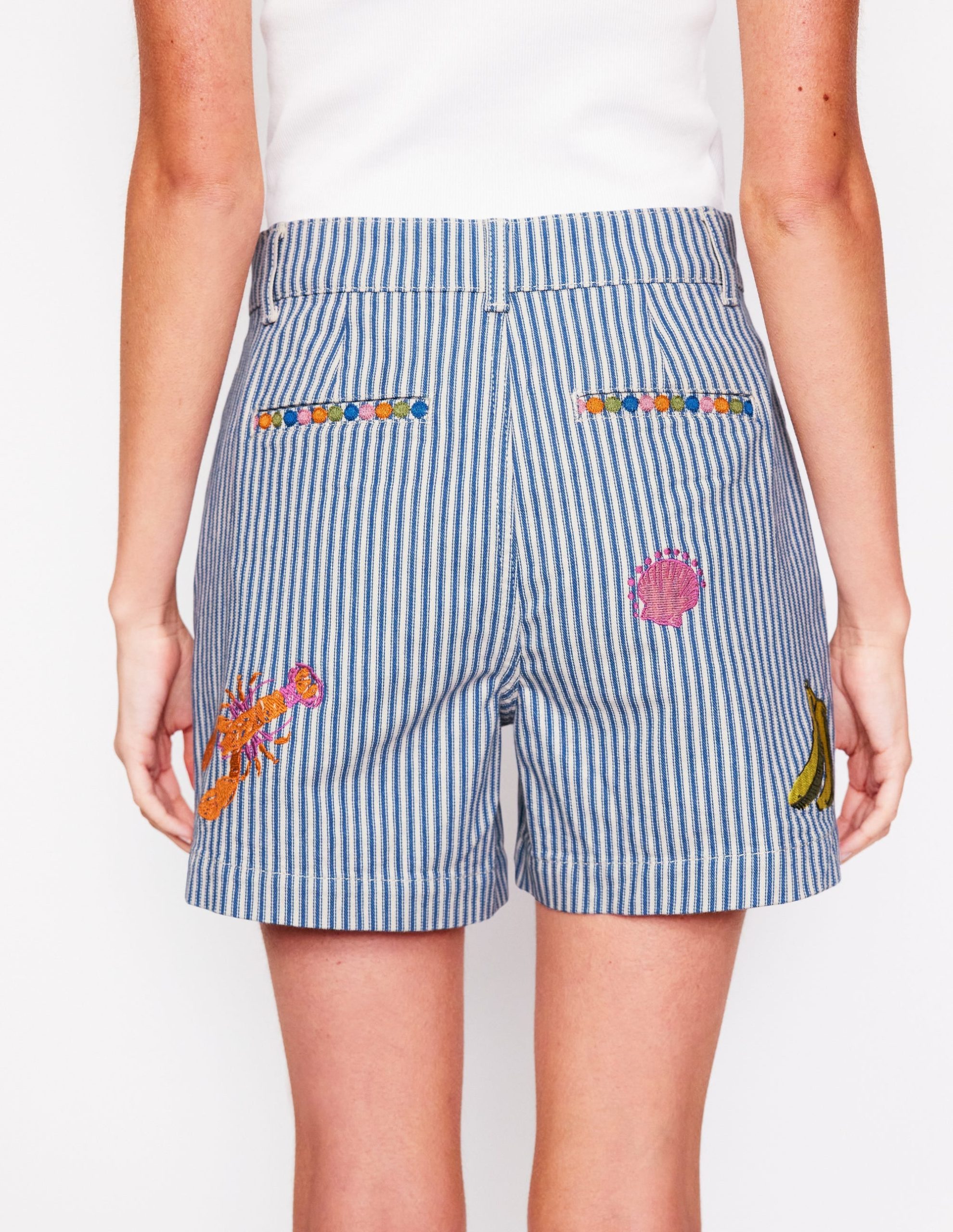 Pocket Front Denim Shorts-Ticking Stripe Embroidery