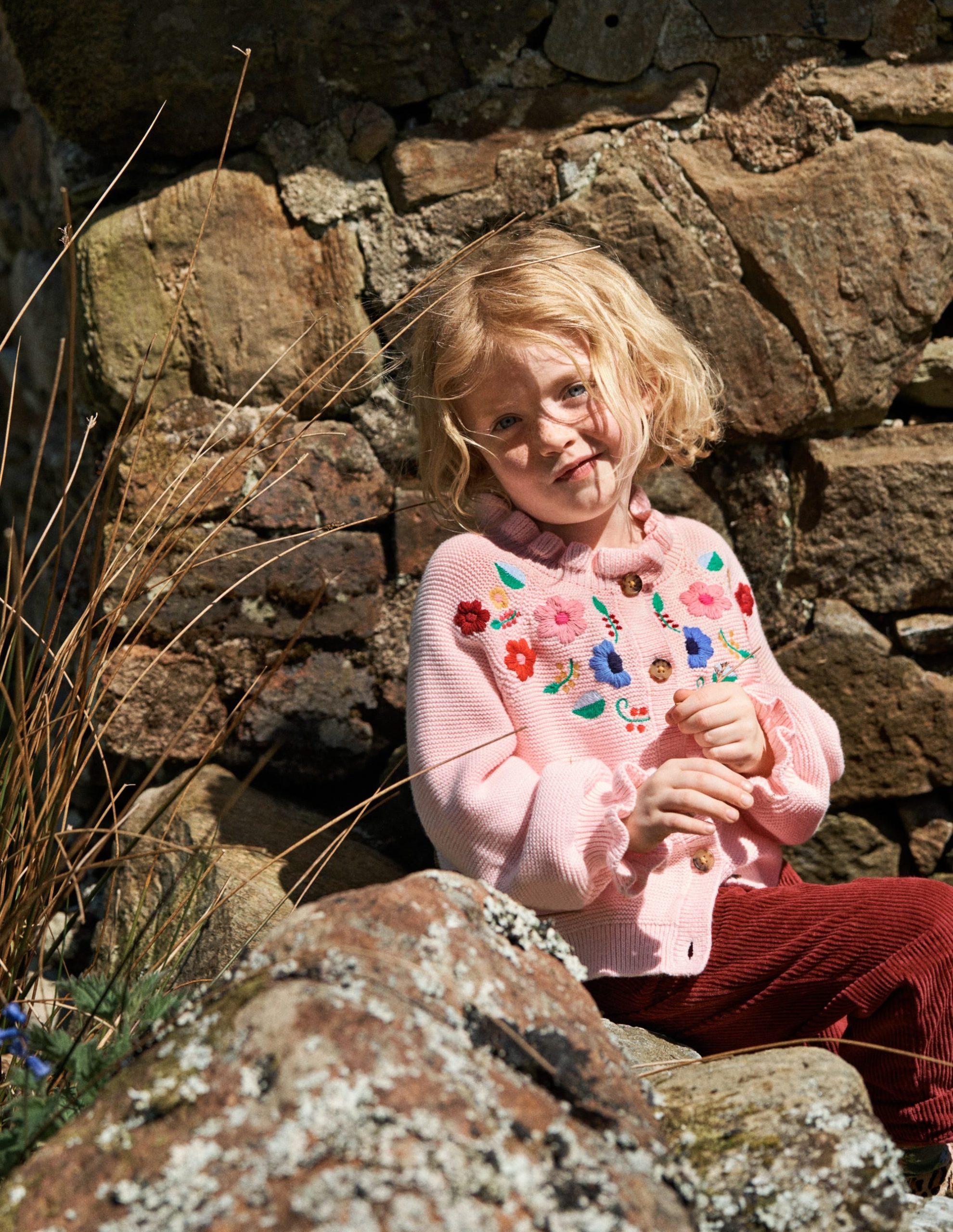 This cosy cardigan is almost too sweet for words. but we’ll do our best. We added frills to the neckline and cuffs. but it’s the colourful embroidery across the front that makes it one to be treasured and passed down to younger Minis.