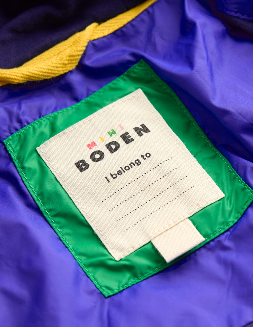 The borg panels make this colourful jacket so soft Minis will transform into huggable (and easy to spot) everyday explorers. The elasticated hood. quilting and two fleece-lined pockets will keep them toasty.