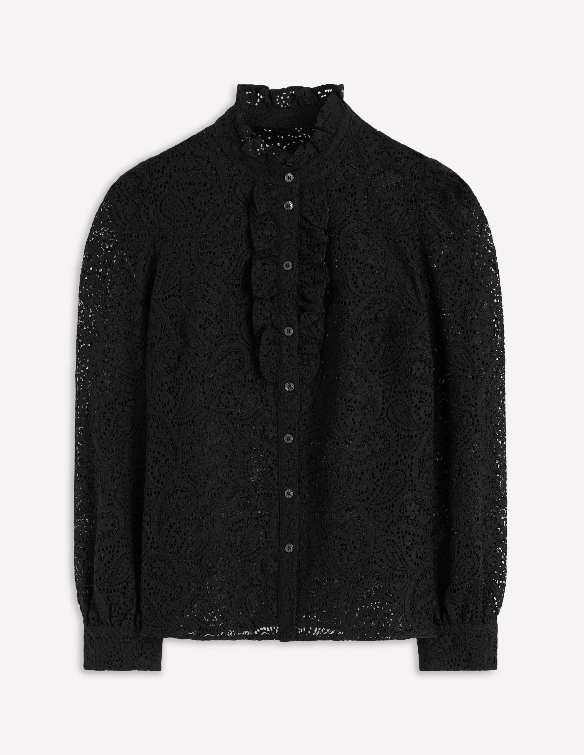 Our Sasha lace shirt channels effortless vintage charm in a romantic modern way. The ruffle front and frilled neckline adds just the right mix of sweet and statement. Choose from neutral black or ivory for endless outfitting options.