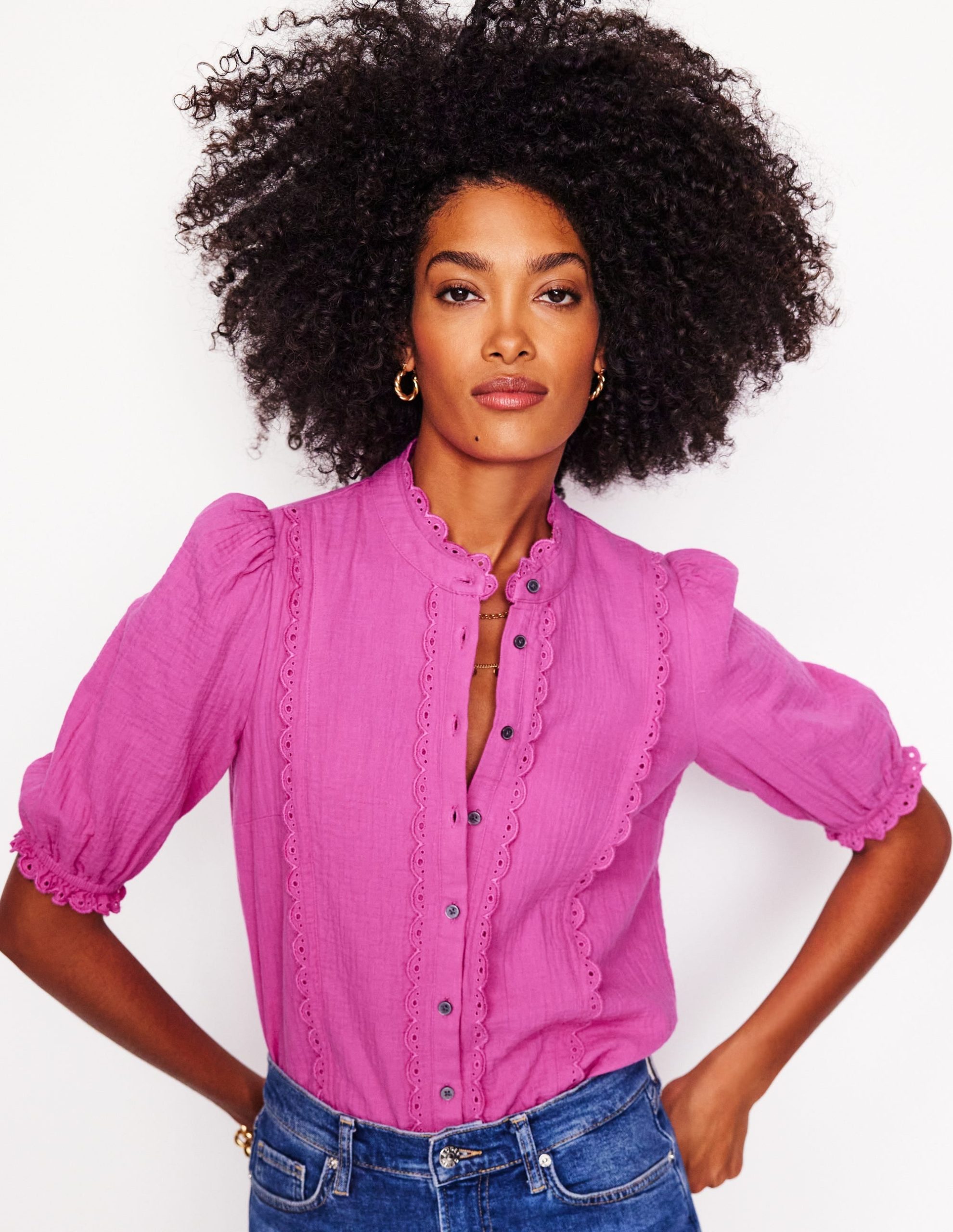Decorated with scalloped trims in abundance. this relaxed-fitting double cloth blouse is a modern take on romantic styles.