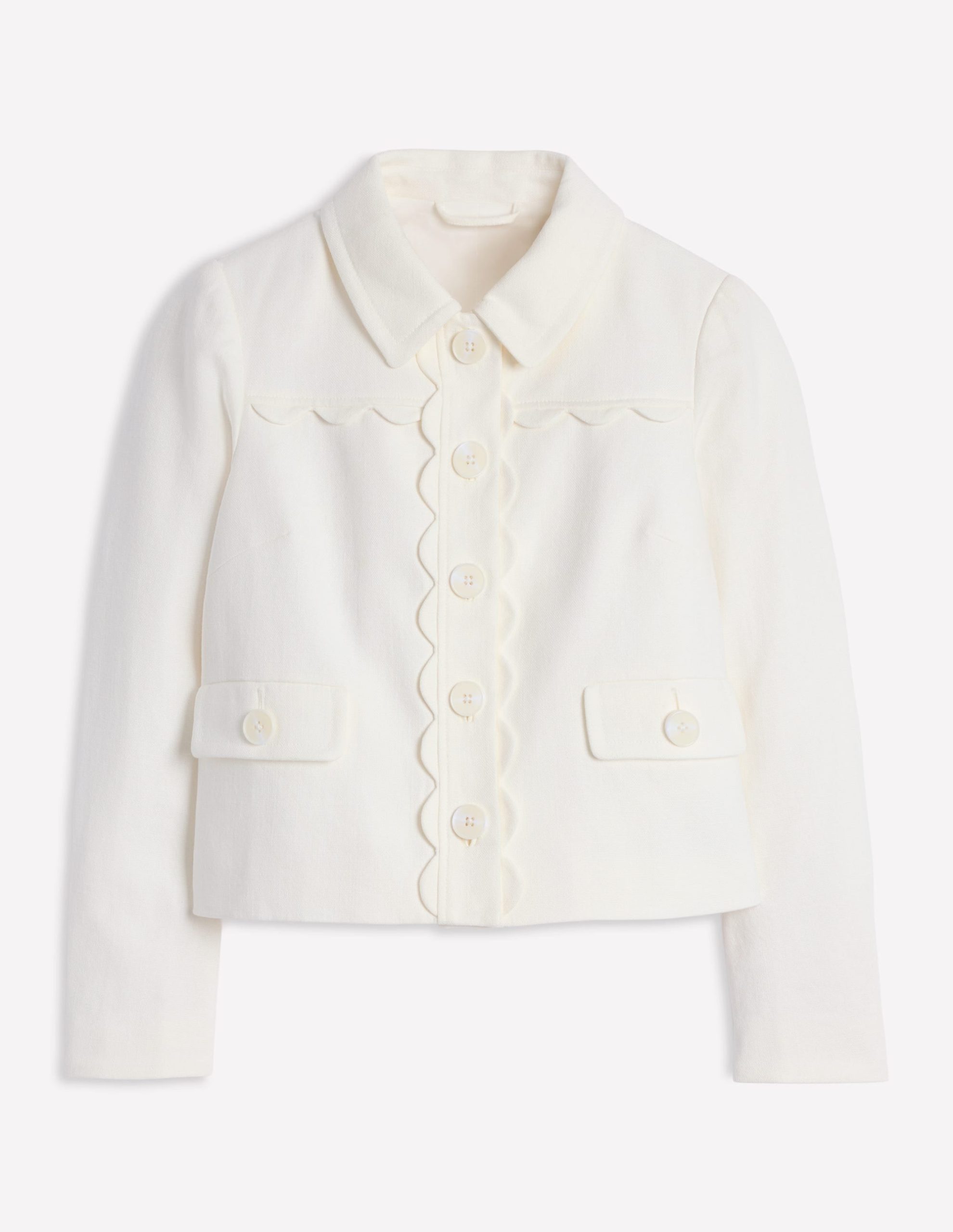 Heavy duty layers are a thing of the past. Hurray! This summer-centric jacket is crafted from a cotton and linen mix and acts as a light layer for when the sun sneaks behind a cloud. The adorable scallop trim makes it unique in a Boden way.