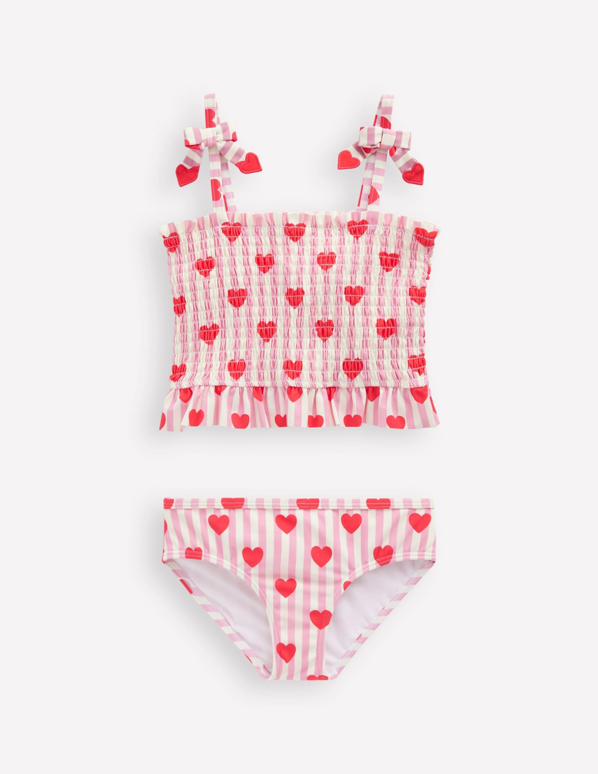 Minis can splash and swim to their heart’s content in our tankini set. It has a stretchy smocked top with a frill at the hem and straps with fixed bows.