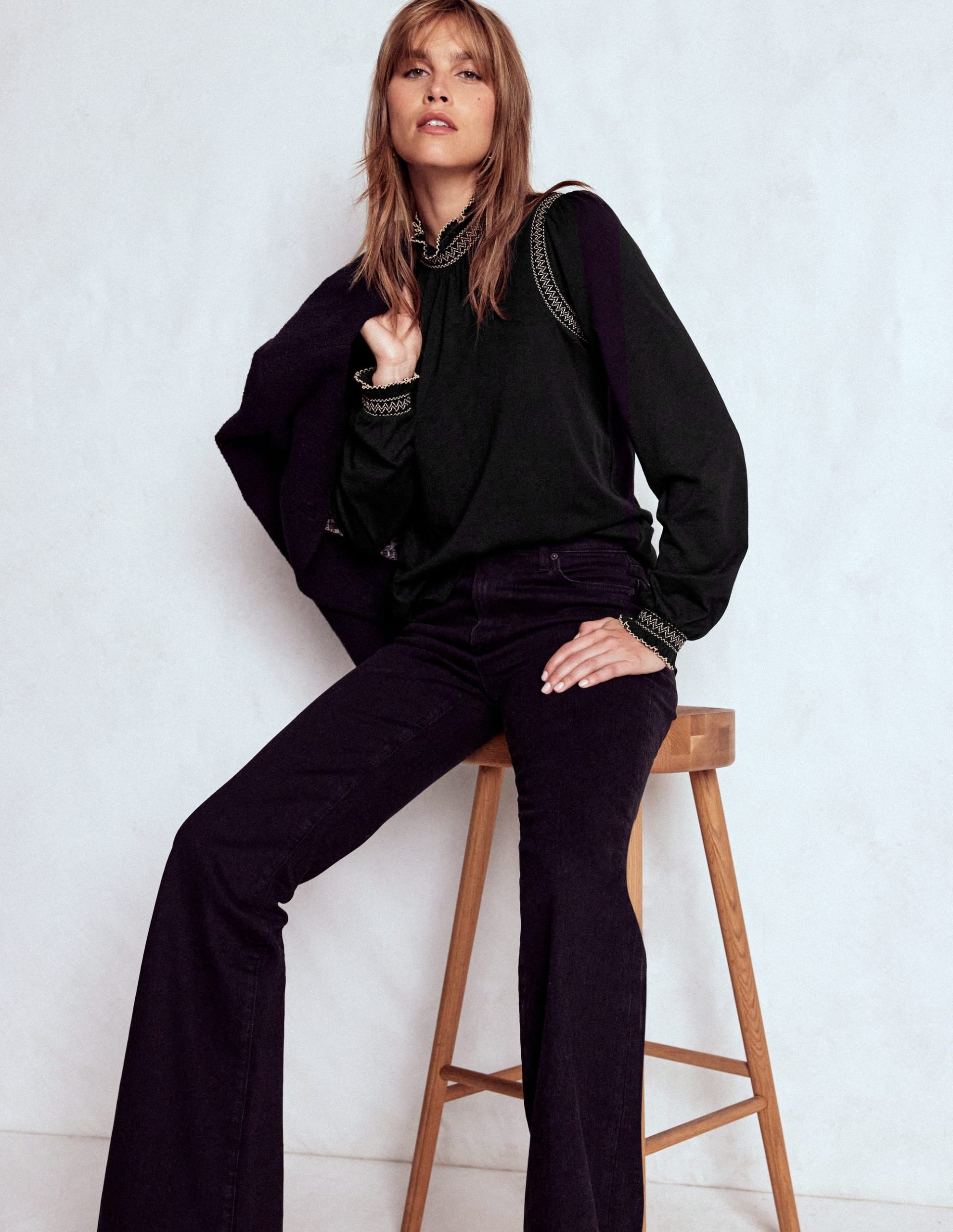 The ideal top for dinners out. Crafted from a cotton blend with smocking it’s comfortable enough to see you through the entire tasting menu with a touch of ruffly romance. Pair with black cords and bold earrings.