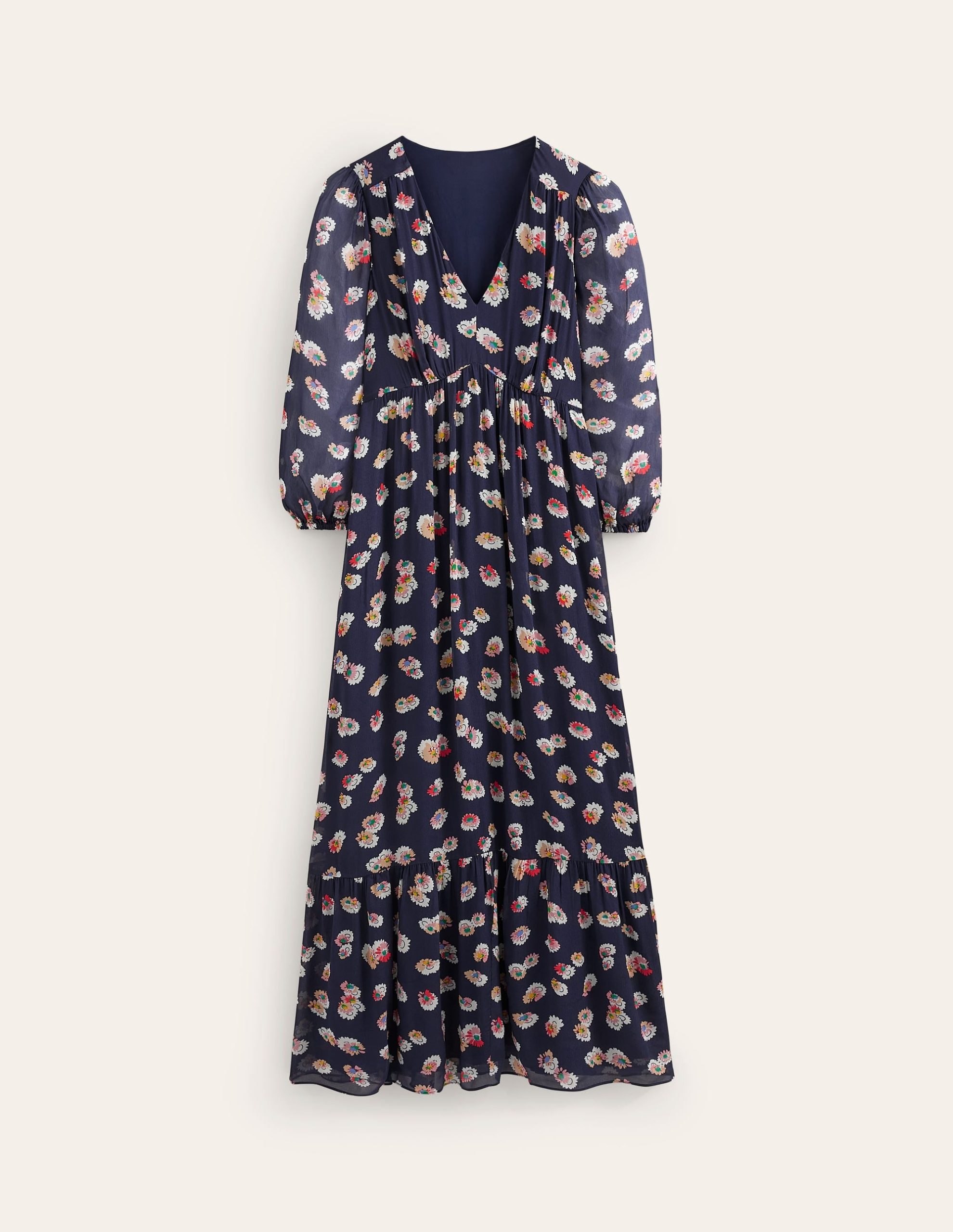 V Neck Puff Maxi Dress-French Navy. Botanical Petal