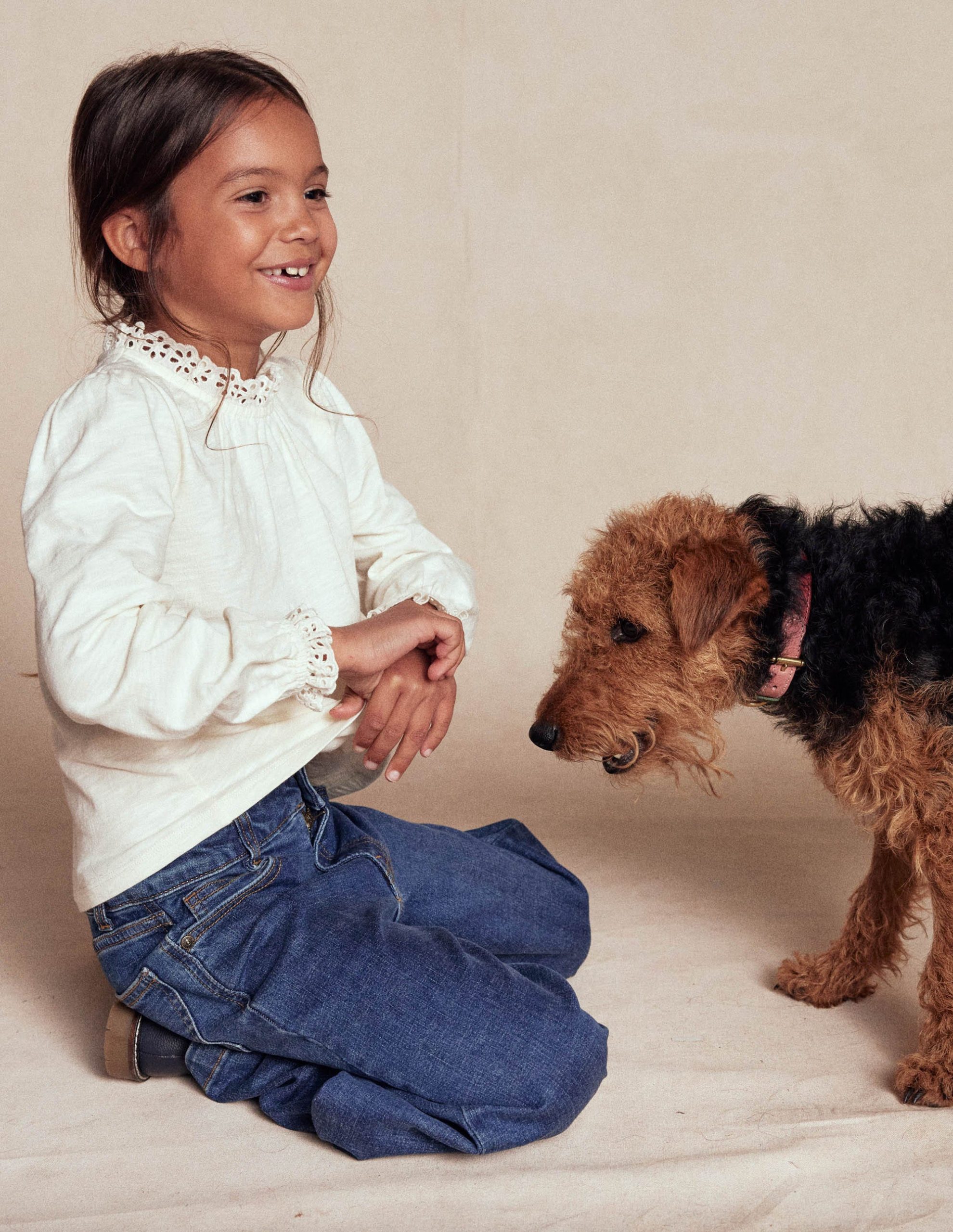 A basic top made special with broderie trim neckline and cuffs and full sleeves. The soft jersey fabric and swing shaped body encourages easy movement. Add layers and a merry band of pals.