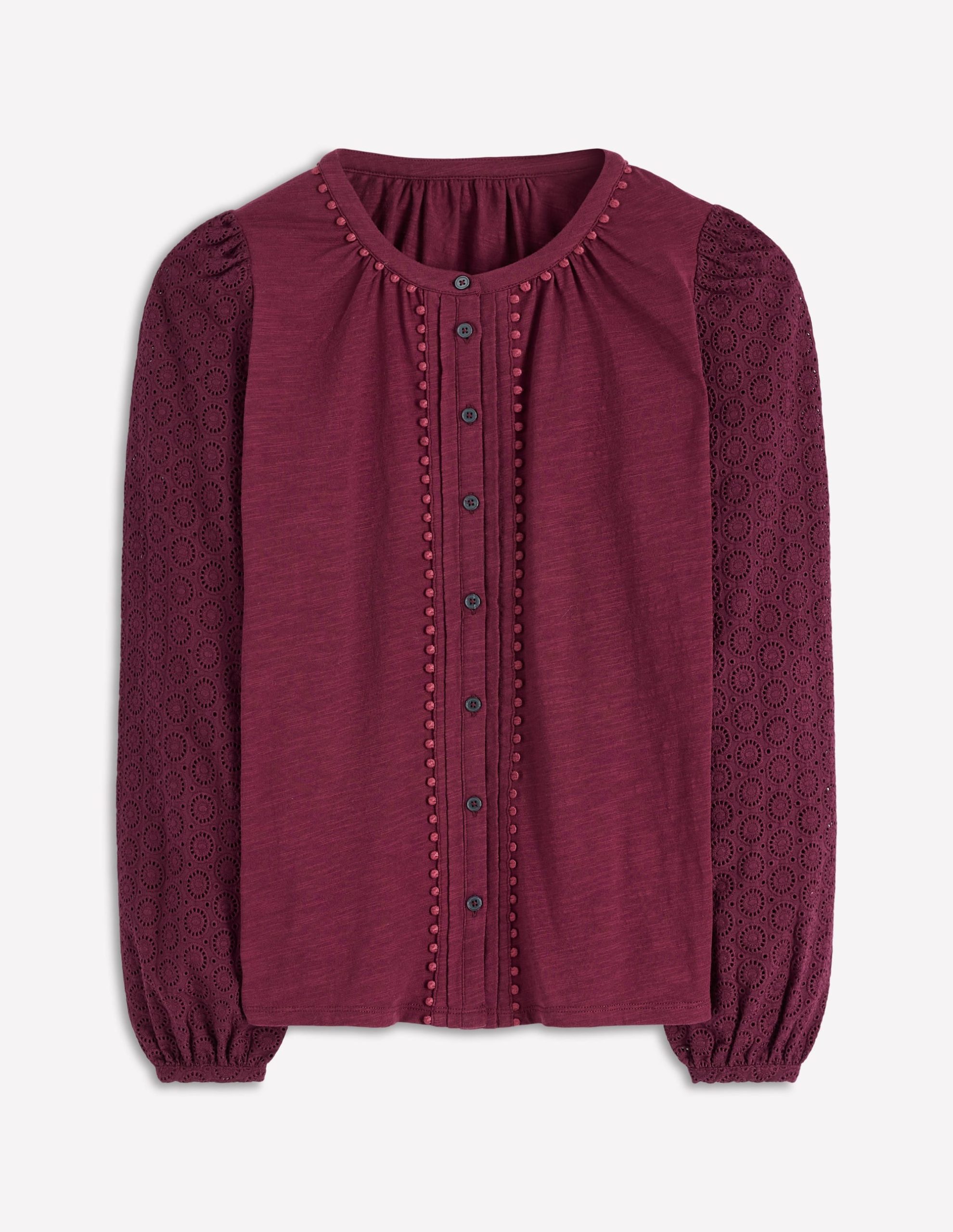 With its broderie blouson sleeves and pom trim. this dreamy cotton jersey shirt has all the good stuff going on ??just like your social calendar.