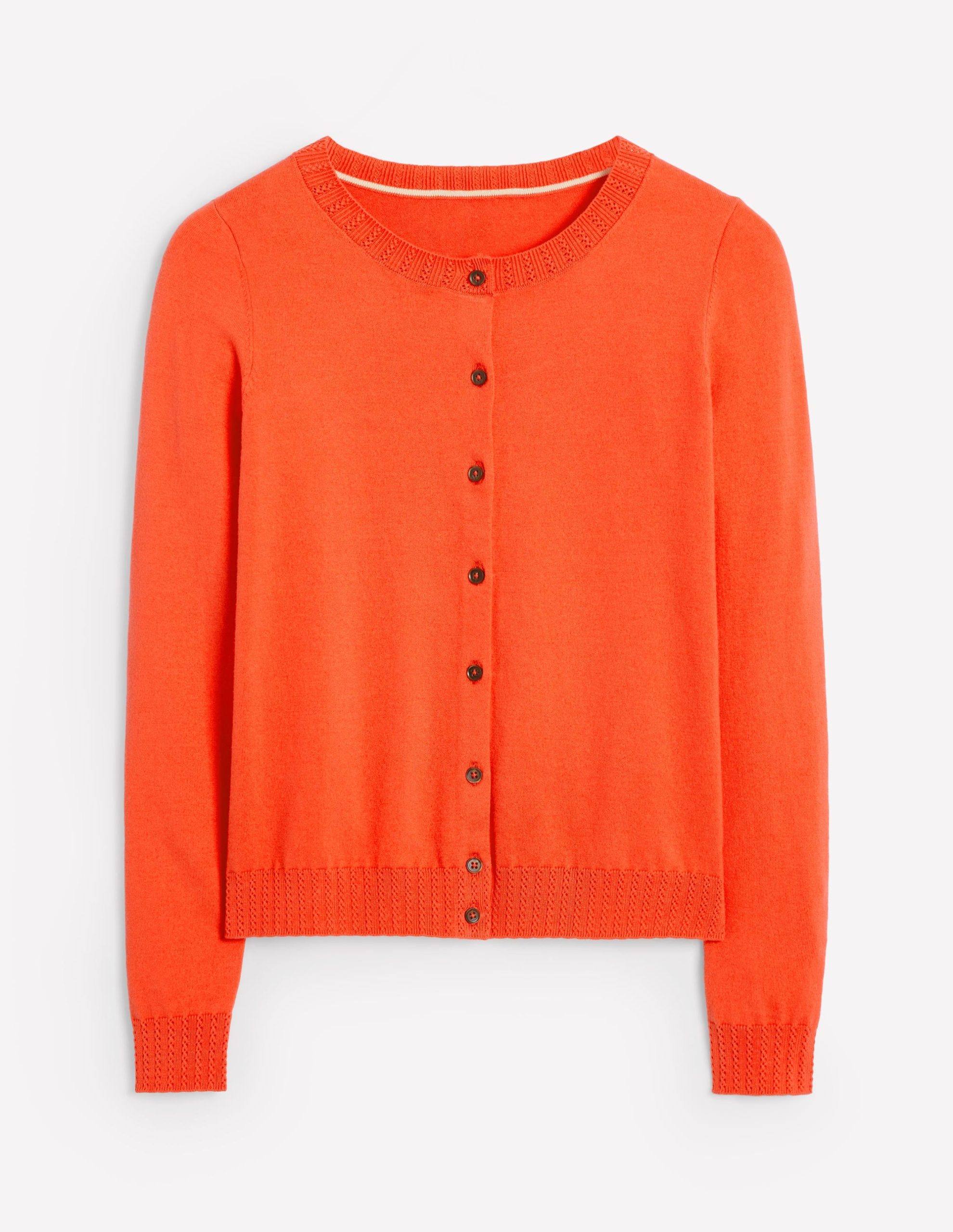 Spun from soft cotton. an intricate knit trim at the hemline. neckline and cuffs gives our Emilia cardigan a delicate finish.