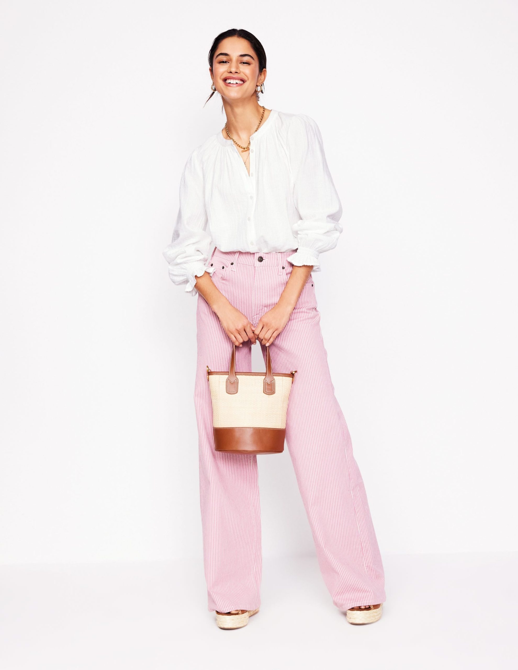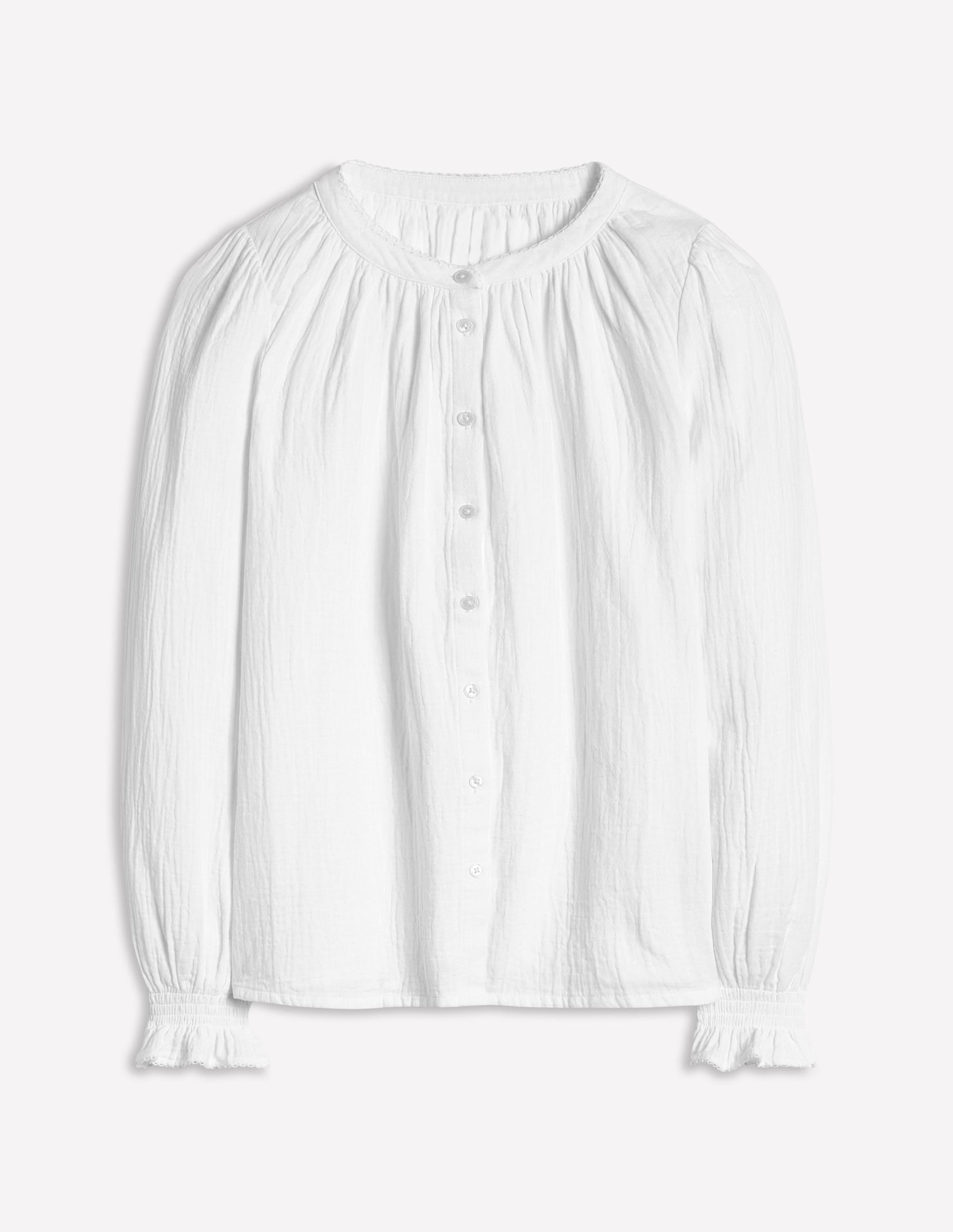 Jeans. trousers. skirts. shorts or even swimwear. there’s nothing our Evie top won’t go with. It’s made from two layers of crinkled cotton and shaped with blousy sleeves and a buttoned front.