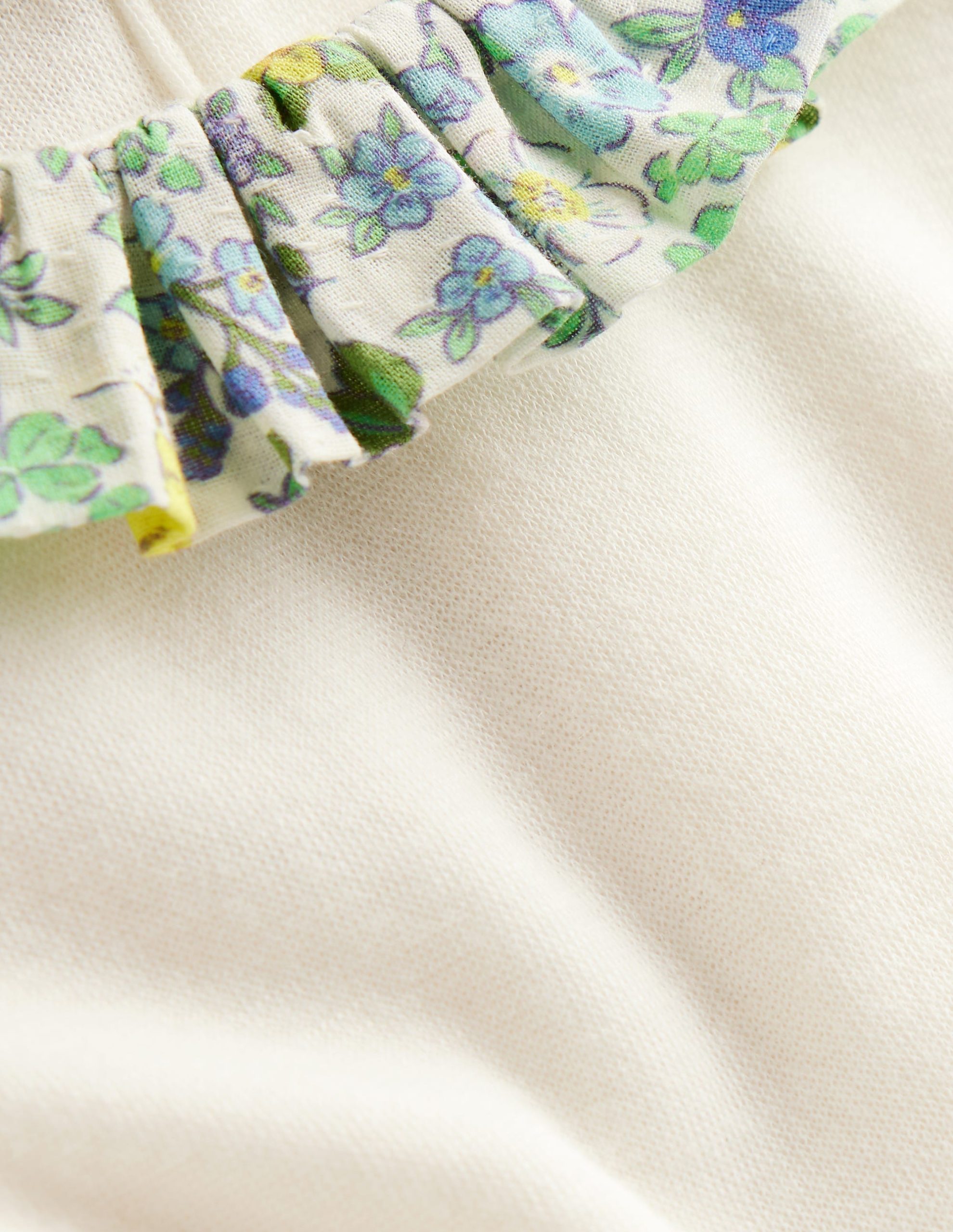 A ready-made outfit makes it easy to get them dressed and out the door (while looking adorable of course). This set has a soft-on-skin cotton top with a frill at the neckline in a contrasting print ?C plus bloomers to match.