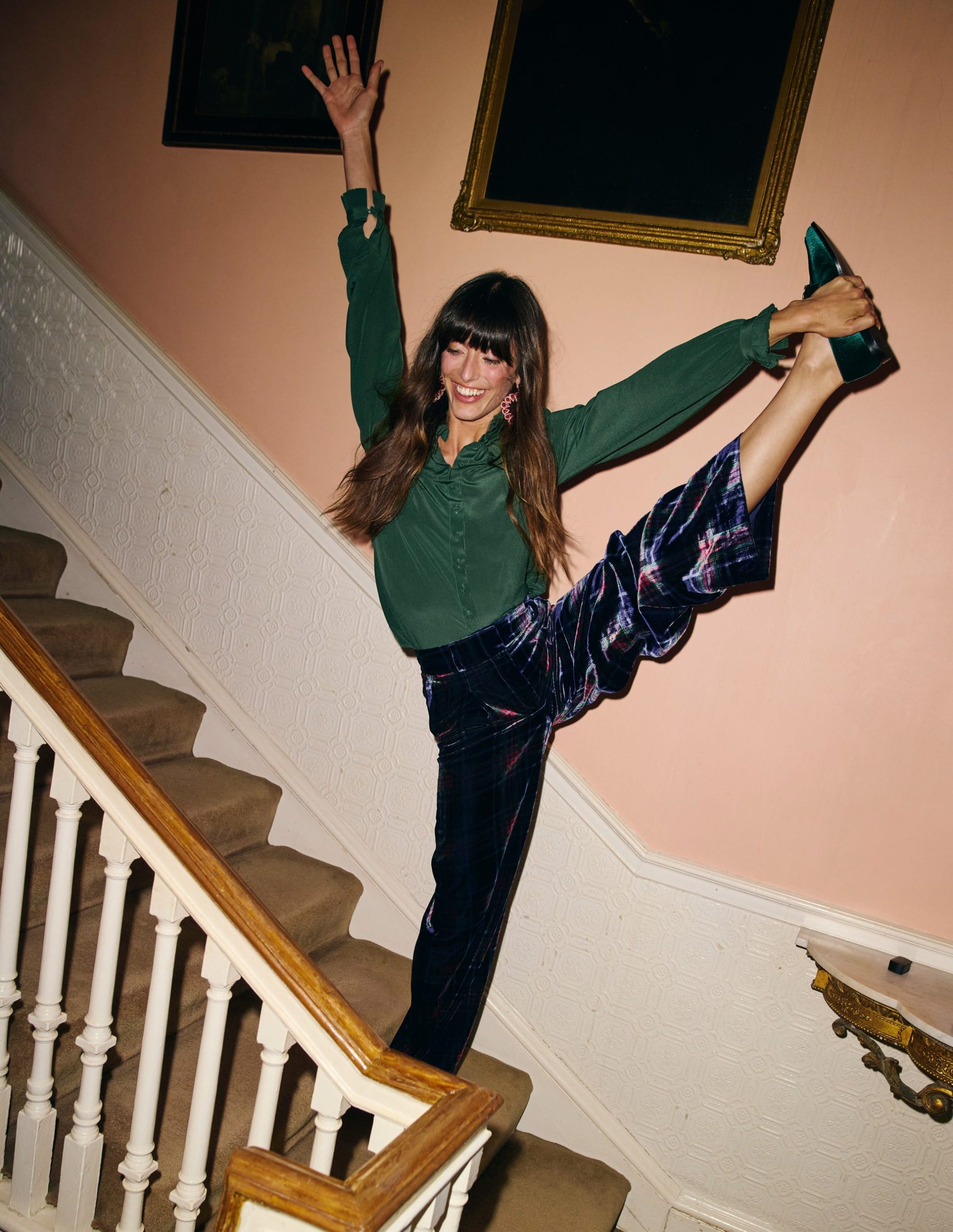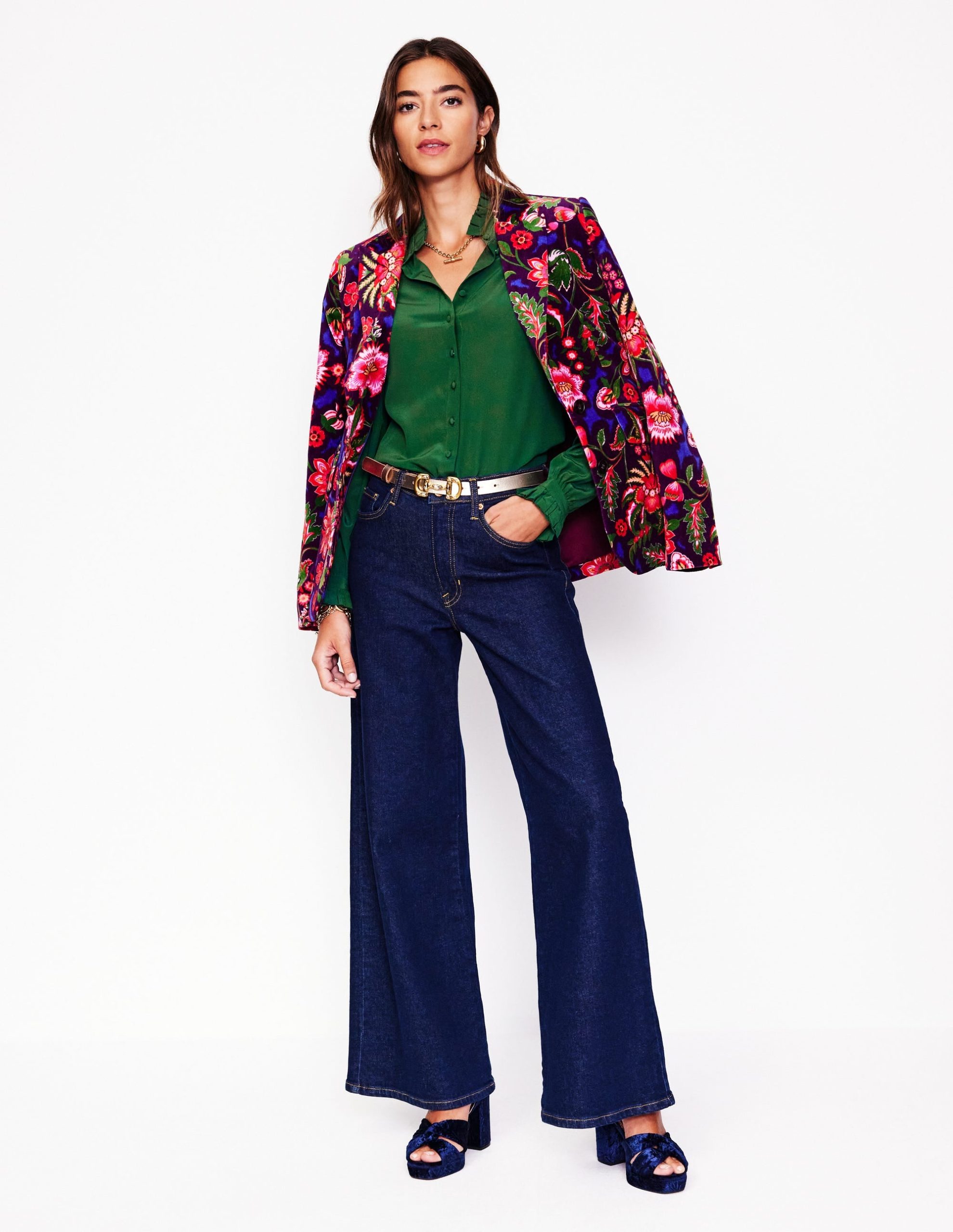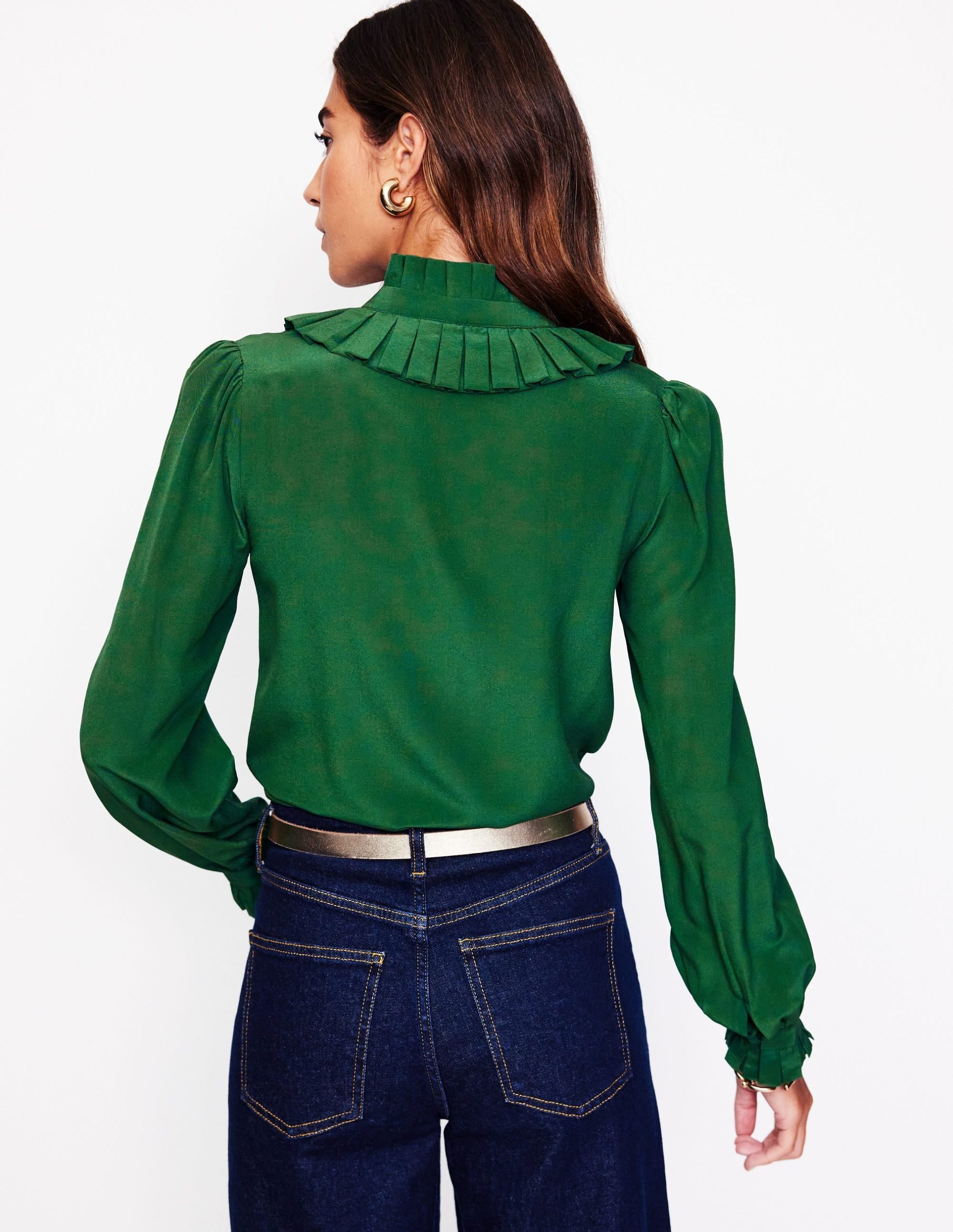 We’re a great believer in ruffled shirts for adding a bit of drama to your day. Soft silk seals the deal.