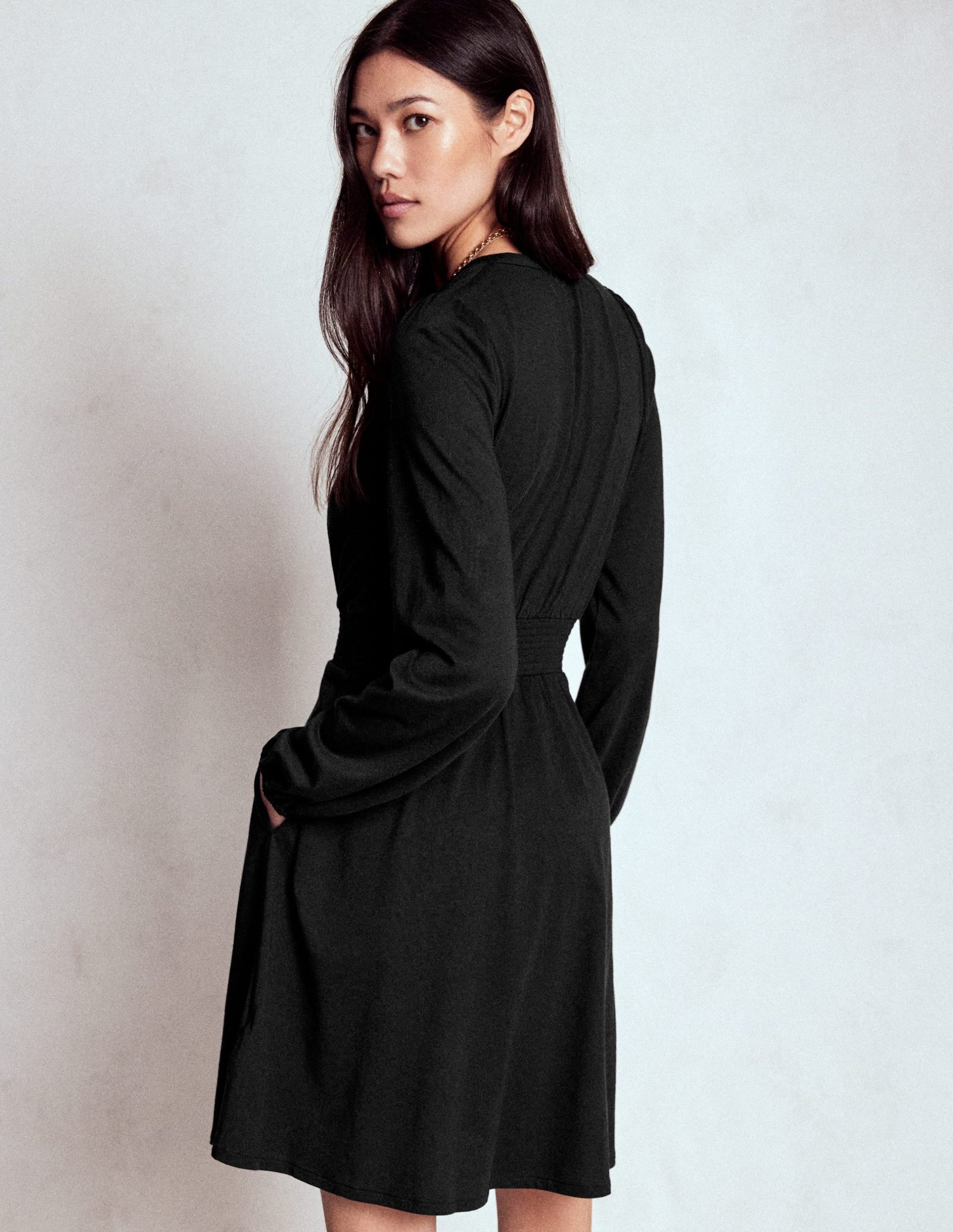 The crease-free jersey fabric makes this dress perfect to wear on a plane or the stuffy commute to work. Snap it up in bright hues and darker prints as the mood takes you and pair with knee-high leather boots.