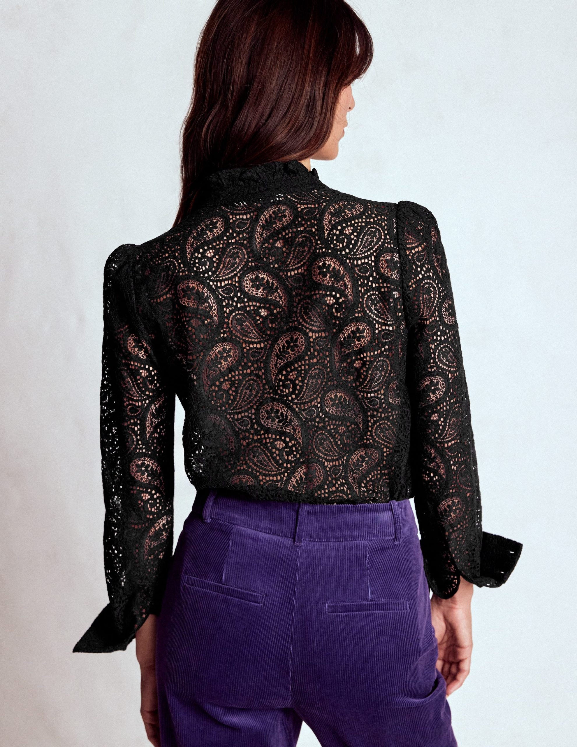 Our Sasha lace shirt channels effortless vintage charm in a romantic modern way. The ruffle front and frilled neckline adds just the right mix of sweet and statement. Choose from neutral black or ivory for endless outfitting options.