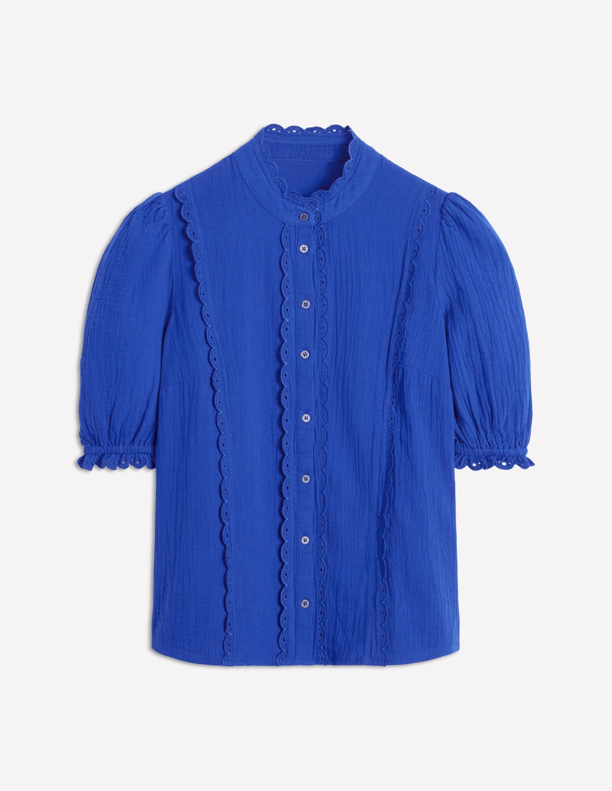 Decorated with scalloped trims in abundance. this relaxed-fitting double cloth blouse is a modern take on romantic styles.