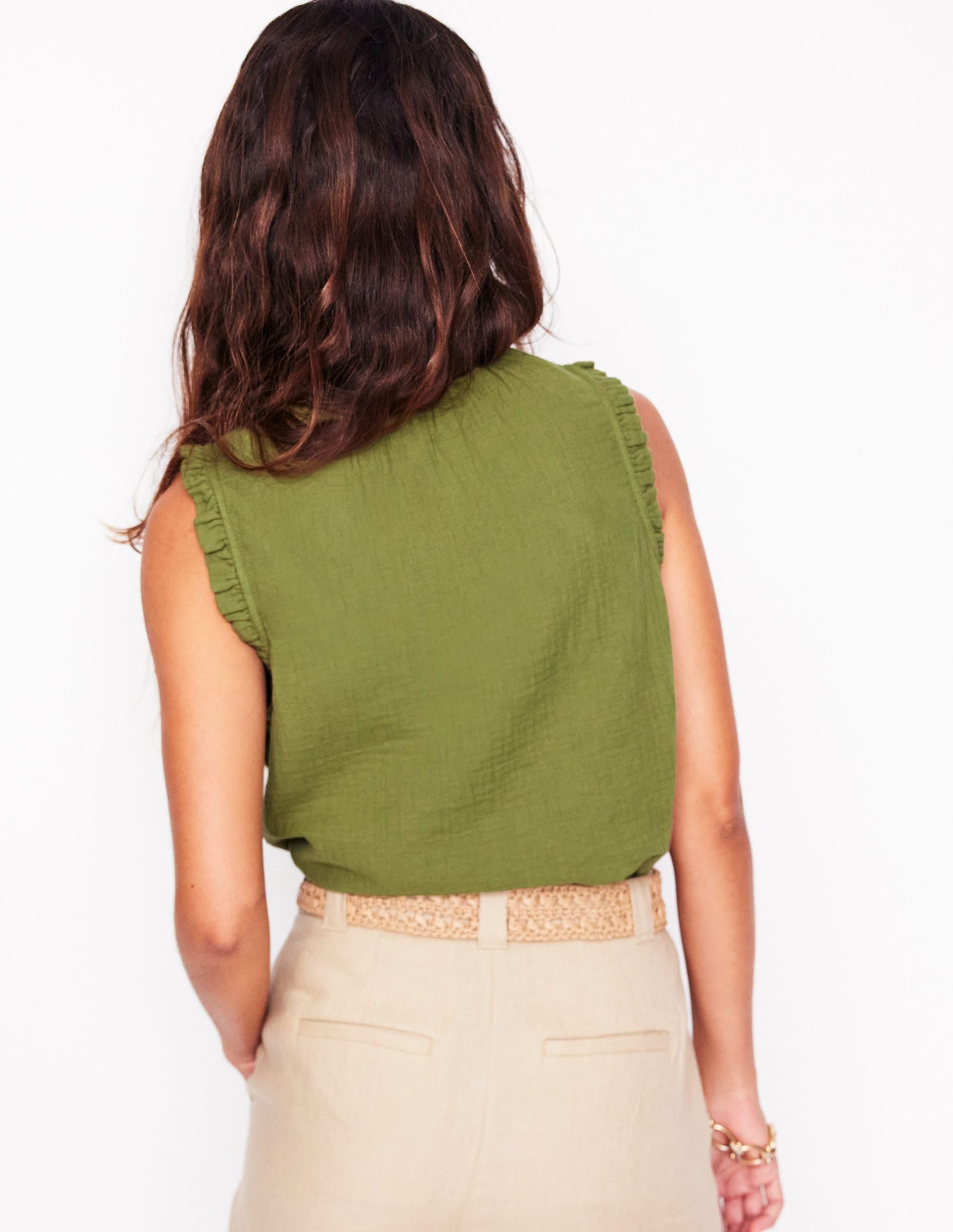 Our Sophie top is floaty and spun from cool. breathable cotton. We’ve added ruffles at the shoulders and neck. too.