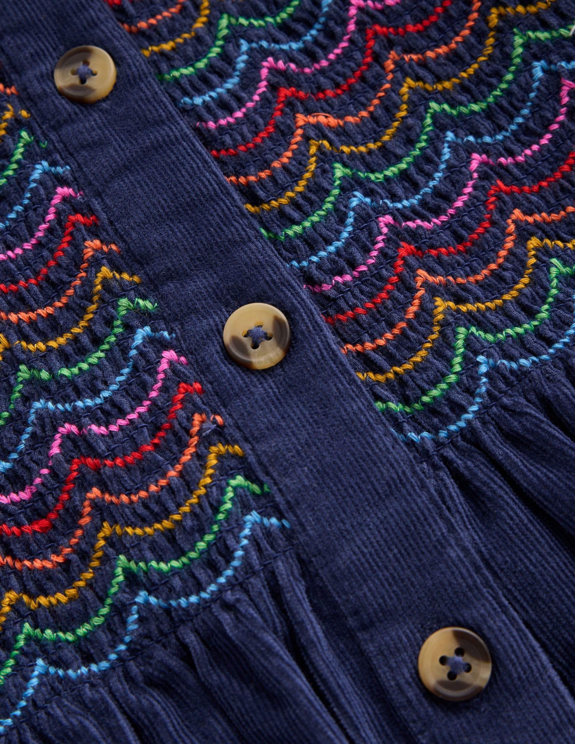 This nostalgic cotton dress has plenty of charming features. including colourful smocking. ruffles and gathered sleeves. It’s super-duper comfy. too.