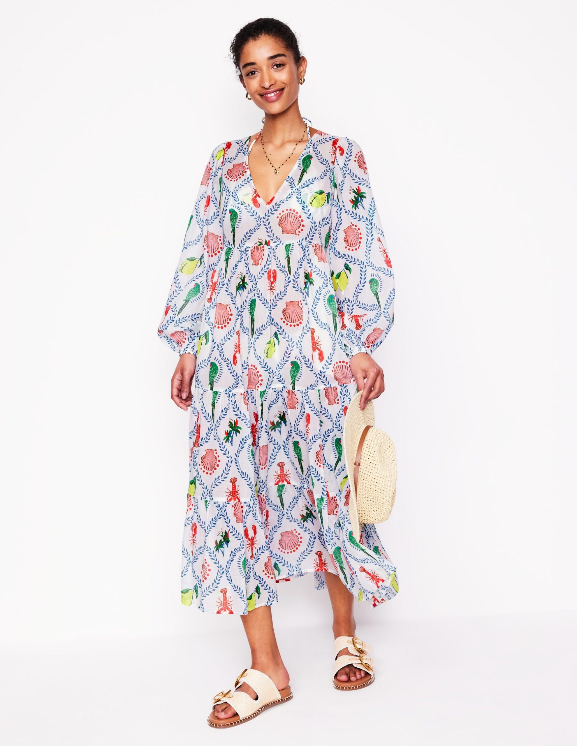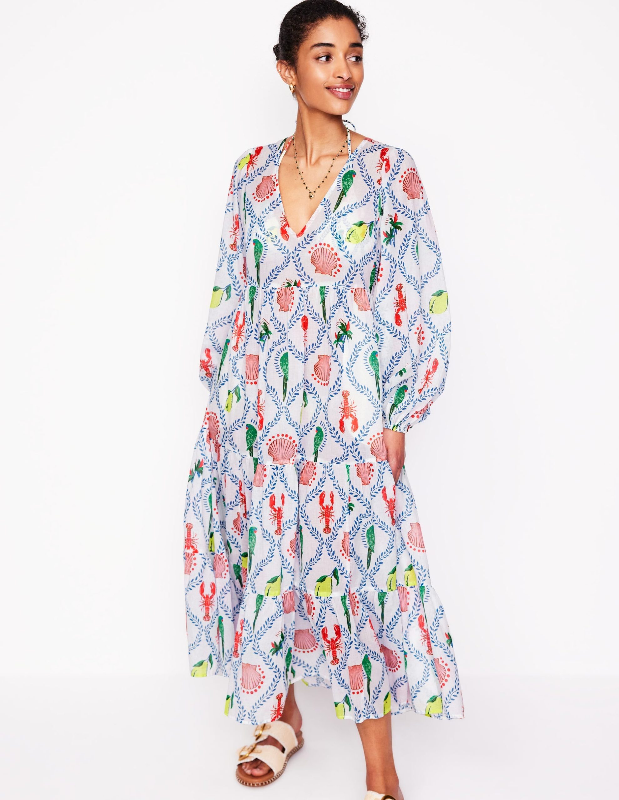 V-Neck Tiered Cotton Kaftan-Ivory. Tropical Bonanza